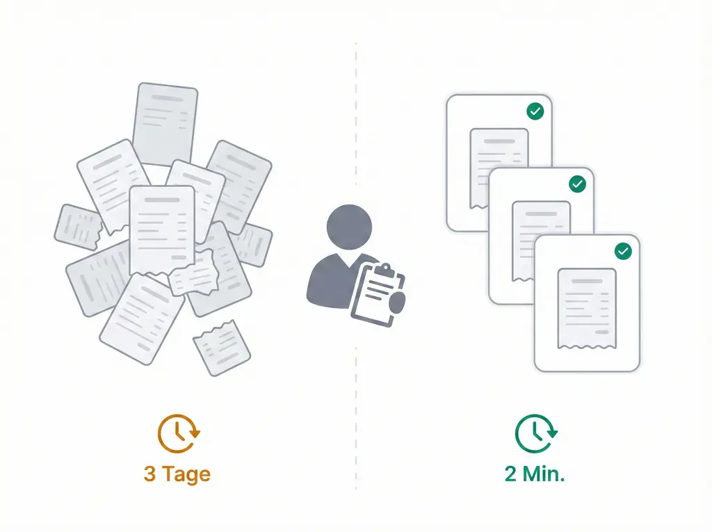 Wieviel haben wir letztes Quartal für Reparaturen ausgeben? „Wo ist die Rechnung von Autohaus Müller?“ Suchen Sie nach Lieferanten, Kategorie, Betrag oder Datum. Fragen, die früher Ordner-Durchsuchen bedeuteten, sind jetzt in Sekunden beantwortet