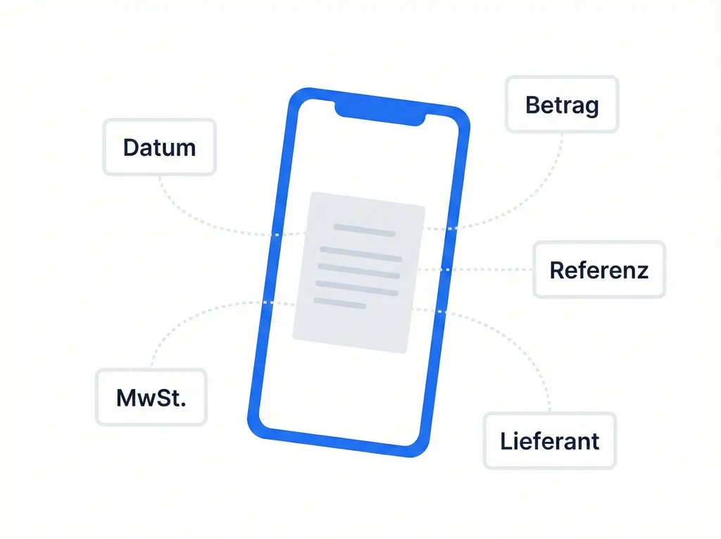 Beleg hochladen oder fotografieren. KI extrahiert alles: Datum, Betrag, MwSt.-Aufschlüsselung, Lieferantendetails, Referenznummern. Sie überprüfen und speichern. Dateneingabe wird zur Datenbestätigung.