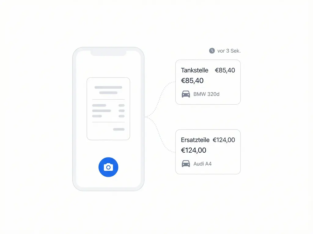 An der Tankstelle bzw. beim Teilehändler keine Belege mehr beiseitelegen für „später“. Sofort mit der Mobile App scannen, dem Fahrzeug zuordnen, solange der Kontext noch frisch ist, und fortfahren.