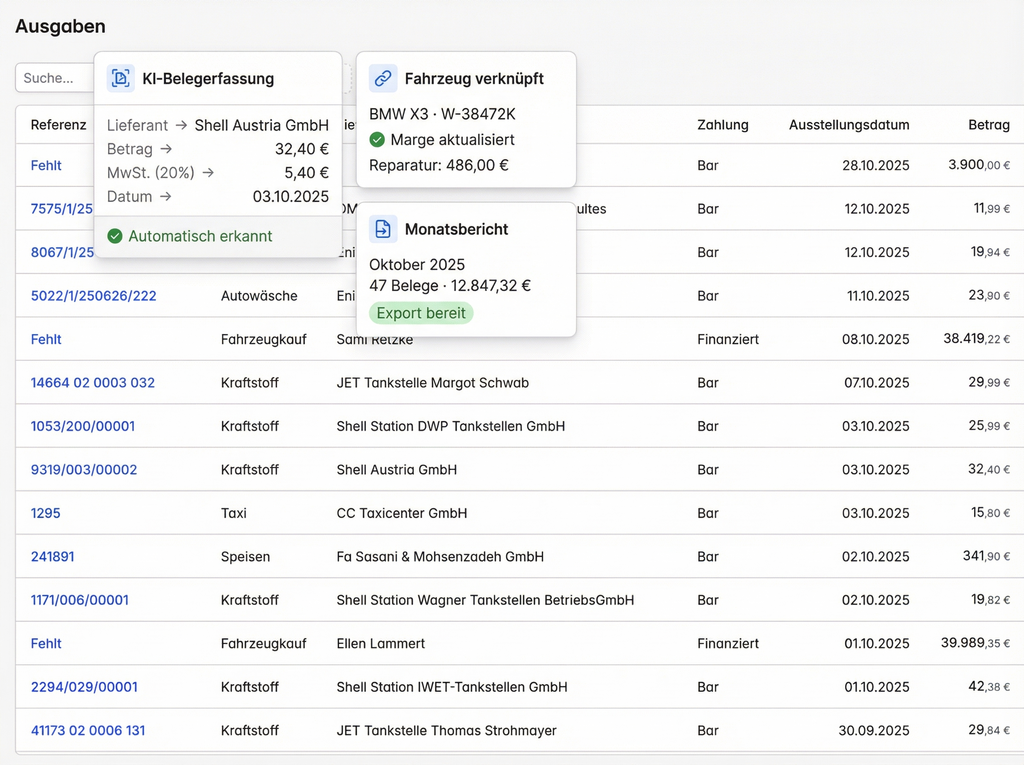 Beleg scannen, KI extrahiert die Details. Mit Fahrzeug verknüpfen, Margen aktualisieren sich sofort. Geben Sie Ihrem Steuerberater organisierte Monatsberichte statt eines Schuhkartons. Wissen Sie genau, was jedes Auto gekostet hat.