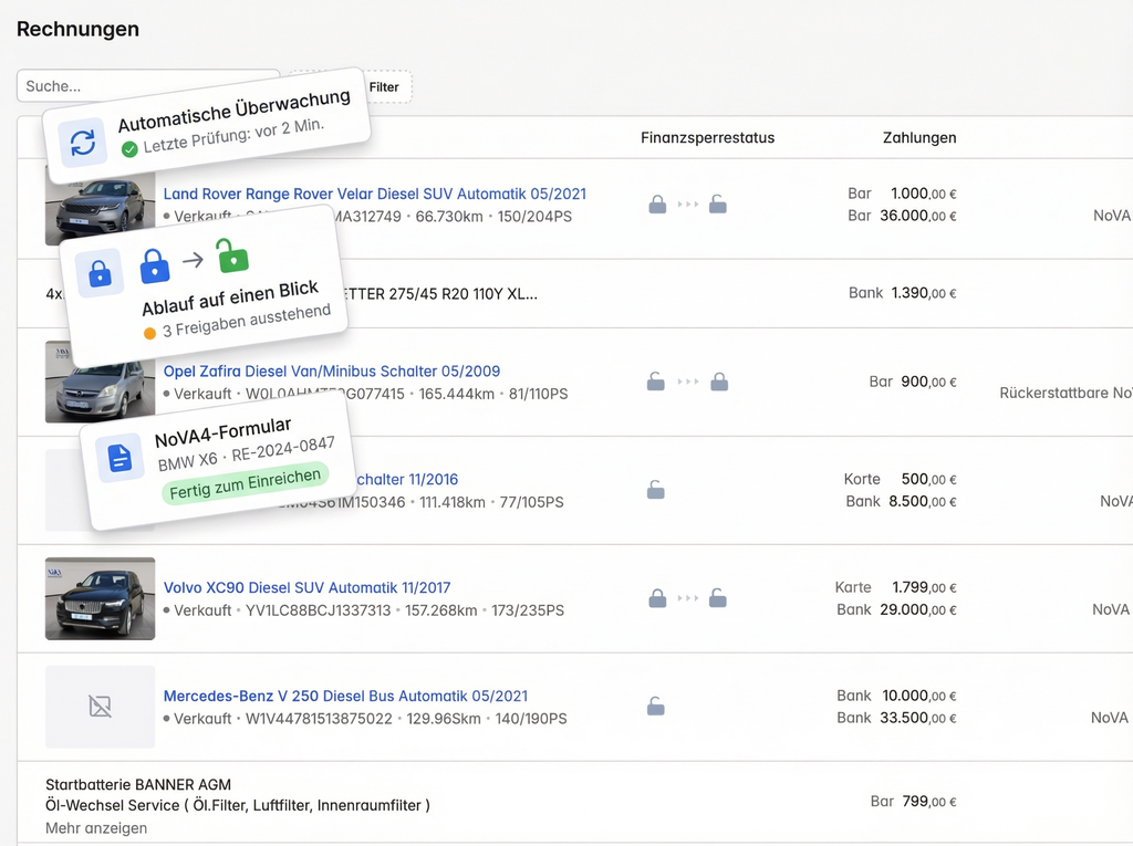 Autoblicker überwacht den Finanzsperrestatus für Ihren gesamten Bestand, ermittelt die NoVA-Behandlung automatisch und verfolgt jede Nachverkaufs-Meldung bis zur Erledigung.