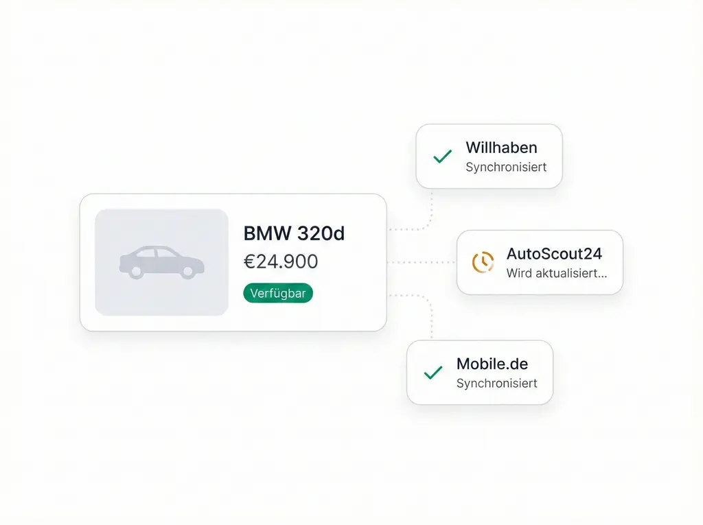 AutoScout24, Willhaben oder Mobile.de mit einem Klick aktivieren. Jede Änderung synchronisiert sich in Sekunden. Reservierungen pausieren Inserate. Verkäufe entfernen Inserate. Ihre Inserate entsprechen jederzeit der Realität.