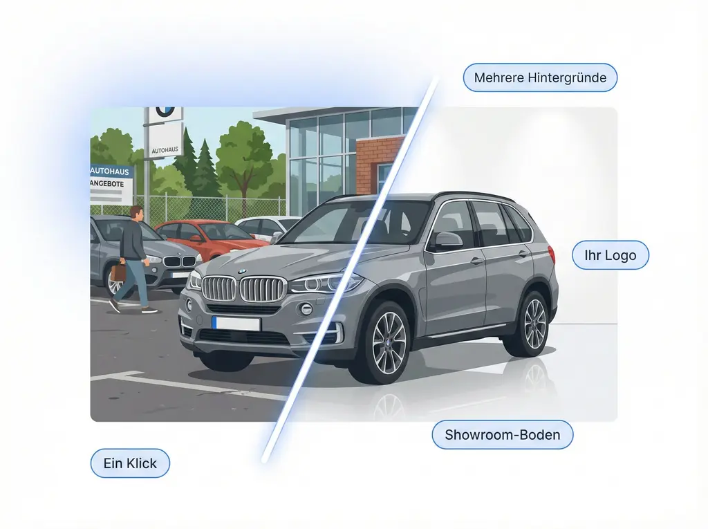 Verwandeln Sie Parkplatzfotos mit KI in Showroom-Qualität. Ihr Logo erscheint automatisch. Drucken Sie Fahrzeugblätter für Ihre Windschutzscheiben. Wirken Sie wie ein großes Autohaus, ganz ohne den Aufwand.