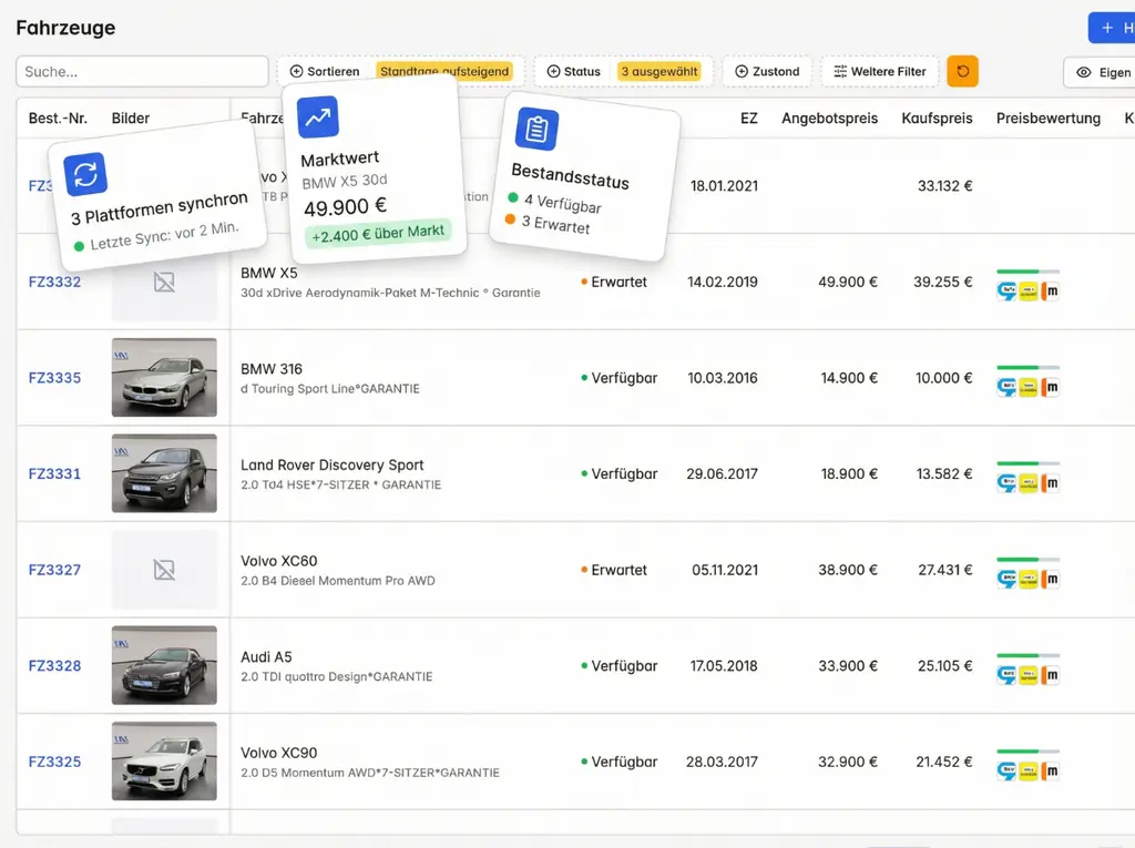 - Filtern nach Preis, KM, Kraftstoff, Status und weiteren Kriterien