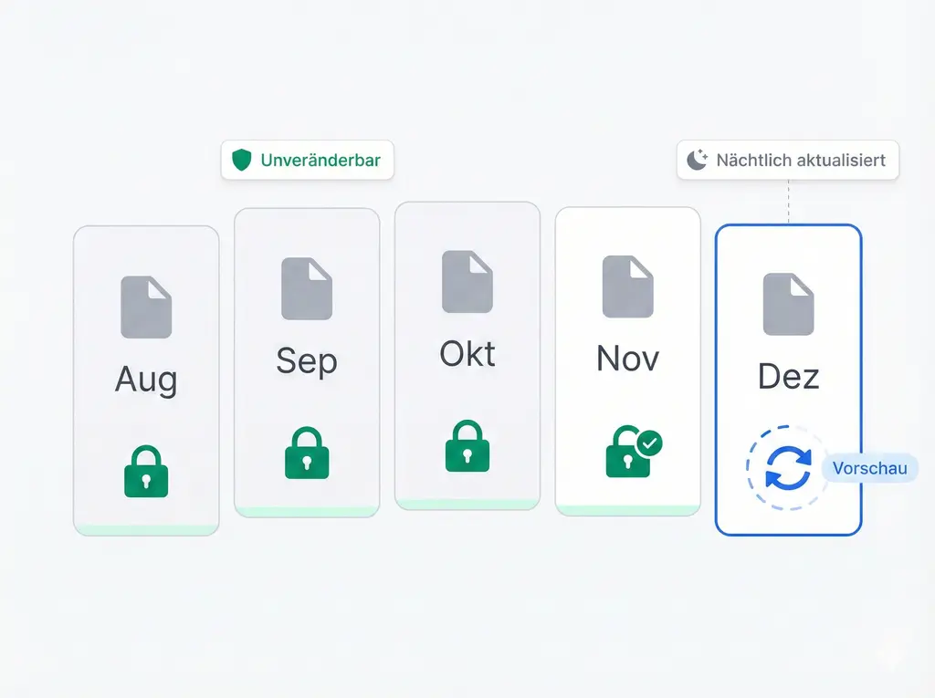 Am Monatsende werden Berichte automatisch als permanente Aufzeichnungen archiviert. Während des Monats halten nächtliche Updates die Vorschau aktuell. Historische Integrität für Prüfungszwecke gewährleistet.