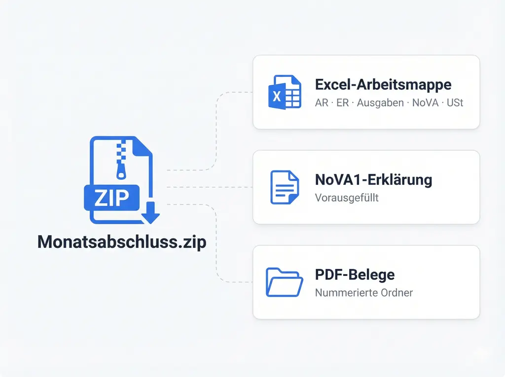 Laden Sie ein ZIP herunter mit drei Dingen: Excel-Arbeitsmappe mit mehreren Blättern, vorausgefüllte NoVA1-Erklärung und nummerierte Ordner mit allen Dokumenten. Monat abgeschlossen.