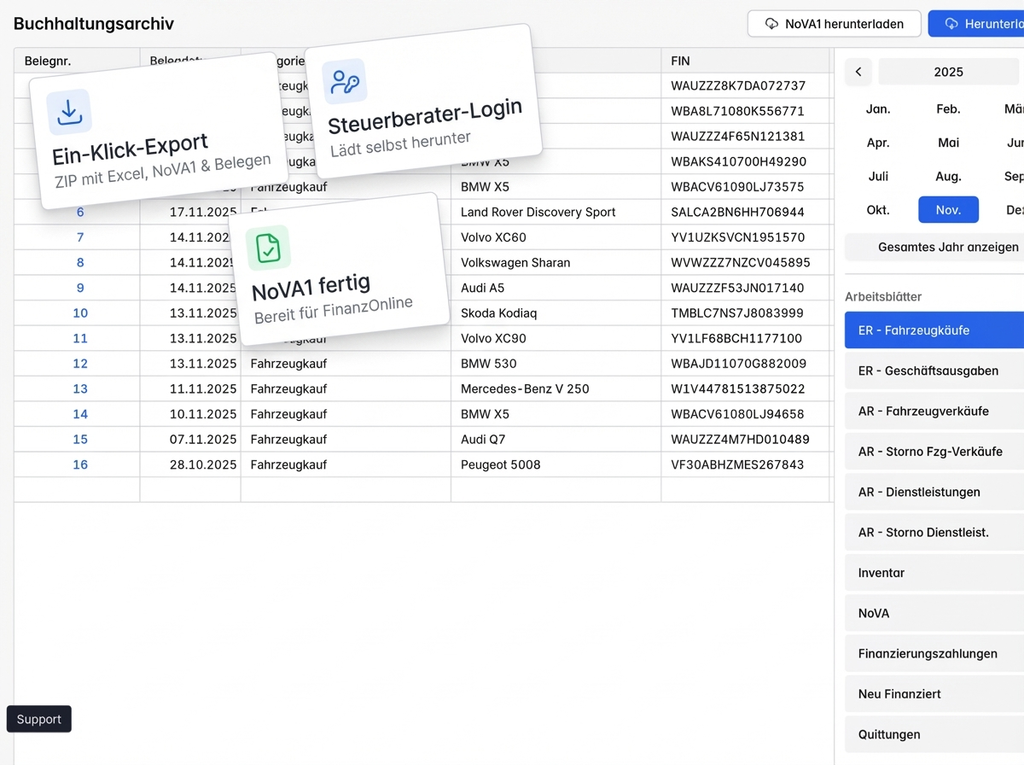 Das NoVA1-Formular ist mit Ihren Daten, Meldezeitraum und berechneten Summen vorausgefüllt. Eine Fahrzeug-für-Fahrzeug-Aufstellung zeigt, wie jede Summe berechnet wurde.