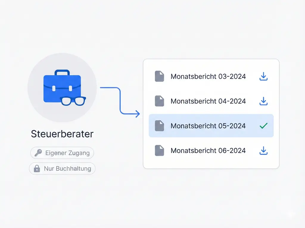 Laden Sie Ihren Buchhalter ein und geben Sie ihm Zugriff nur auf das Buchhaltungsarchiv. Er kann Monatsberichte, Ausgaben-Dokumentation und Rechnungsübersichten selbst herunterladen, ohne dass Sie Dateien exportieren und verschicken müssen.