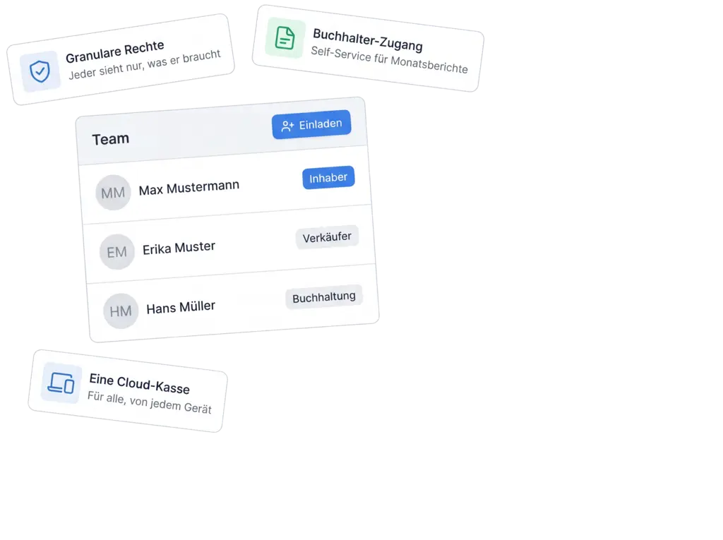 Laden Sie Mitarbeiter, Buchhalter und Partner ein. Weisen Sie Rollen zu, die exakt steuern, wer was sieht und bearbeitet. Jeder arbeitet mit eigener Identität, Sie behalten den Überblick.
